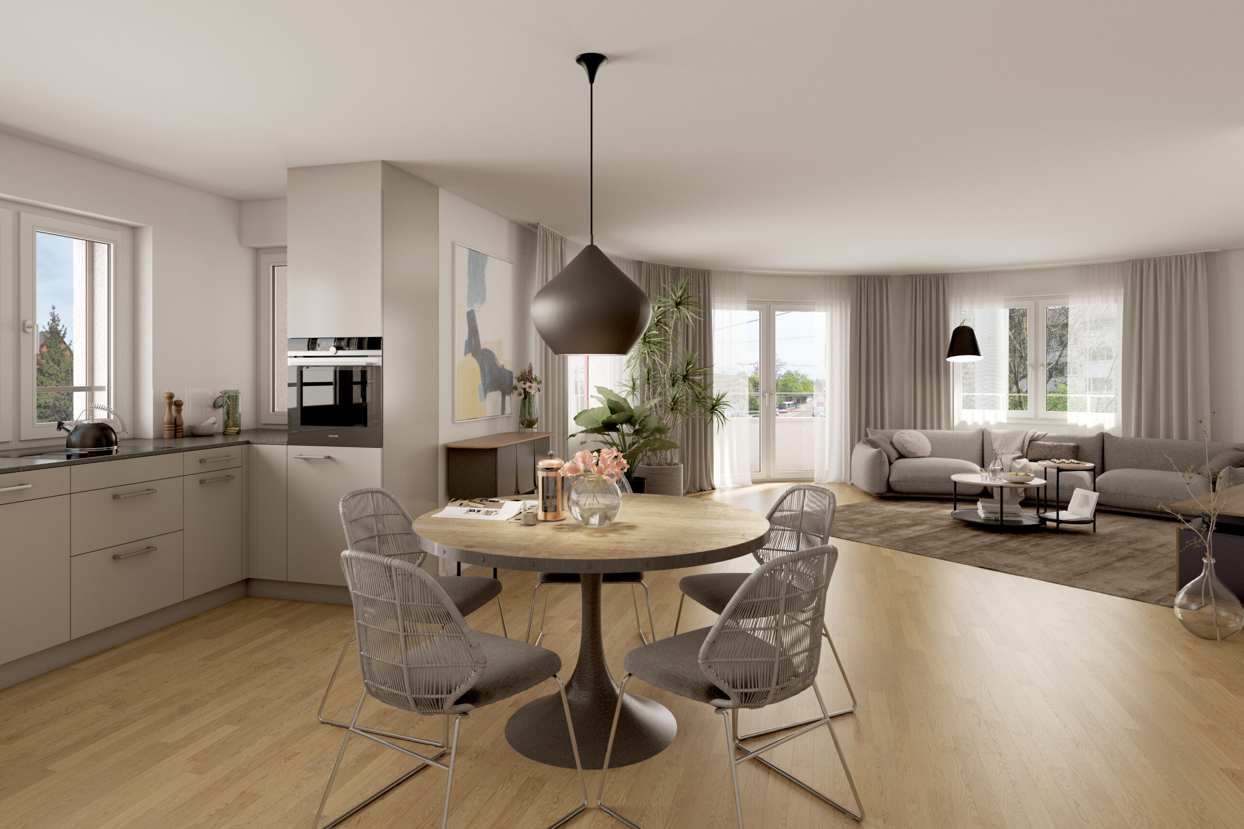 Die 2.5- und 3.5-Zimmer-Wohnungen verteilen sich auf vier Etagen. Mit modernem und hochwertigem Interieur schaffen sie eine warme und einladende Wohnatmosphäre, während die offenen Grundrisse Flexibilität bei der Einrichtungsauswahl bieten. Jede Wohnung zeichnet sich durch eine helle, offene Küche mit modernen Küchengeräten und schönen Parkettböden aus, sowie ein Badezimmer mit Wanne oder Dusche und einer Kombination aus Waschmaschine und Tumbler. Zusätzlich bieten gemütliche Balkone in den Obergeschossen und Sitzplätze im Erdgeschoss Raum für Entspannung im Freien. Im 4. Obergeschoss erwarten Sie 3 exklusive Dachwohnungen mit besonderem Charme.